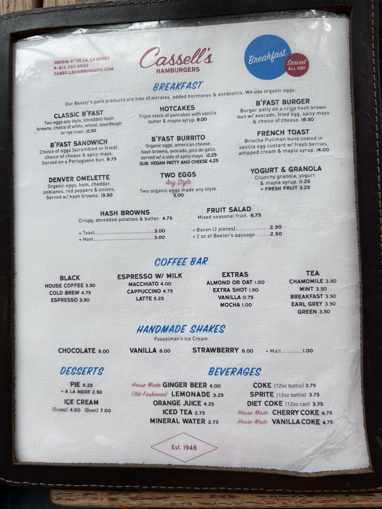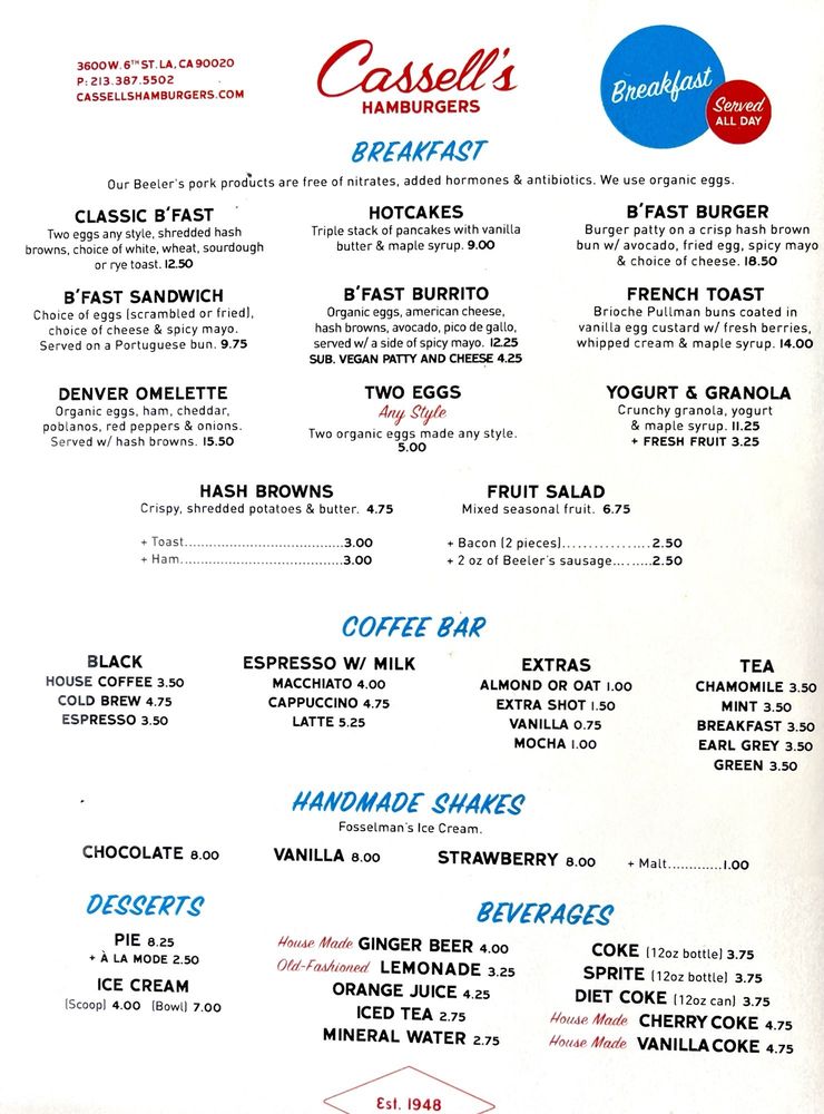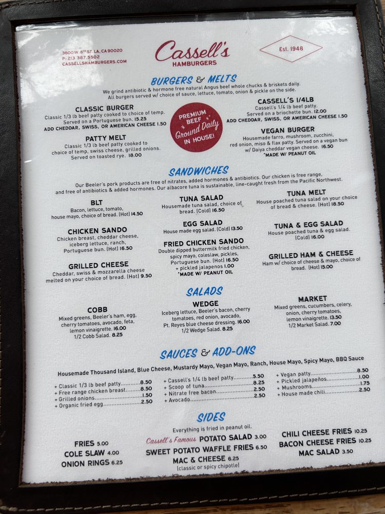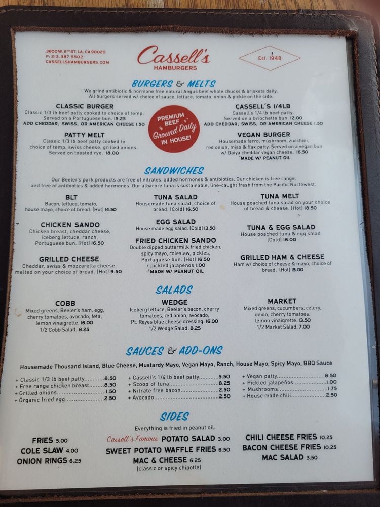 Cassell’s Hamburgers is a trendy and casual restaurant located in Los Angeles, offering a variety of burger options made with house-ground beef patties and fresh toppings. The menu also includes melts, sandwiches, and vegan options. Customers rave about the juicy and flavorful burgers, crispy fries, and delicious shakes. The service is excellent, and the retro charm of the restaurant adds to the dining experience. Some customers mention that the prices can be a bit high, but overall, the quality of the food and the friendly staff make it worth it. With a great selection of burgers and a welcoming atmosphere, Cassell’s Hamburgers is a must-visit for burger lovers in LA.